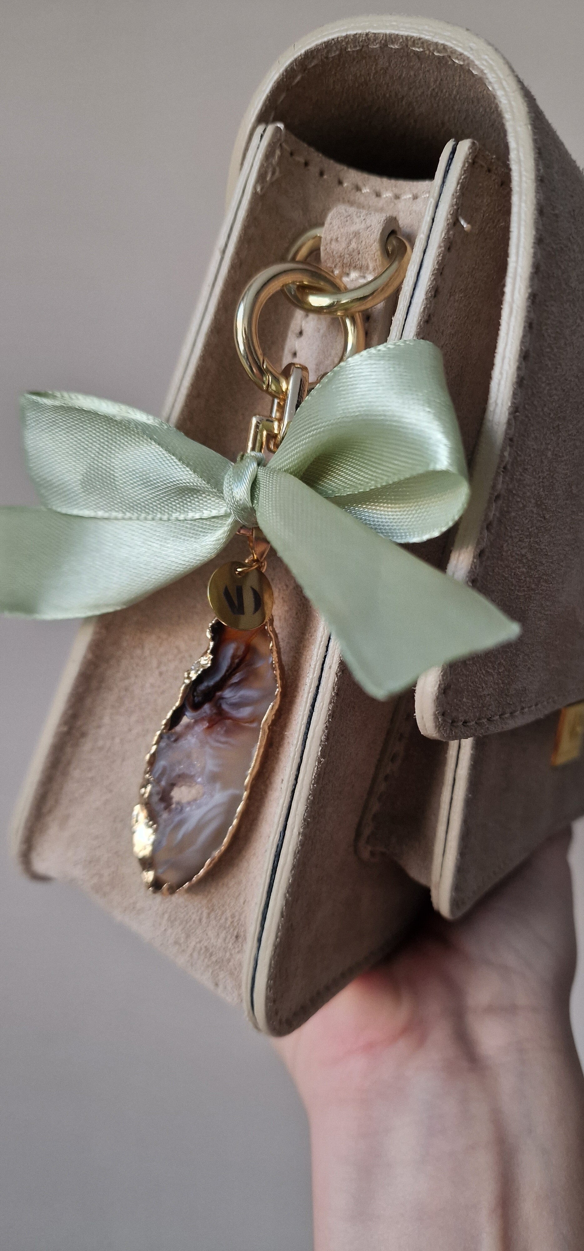 Een prachtig afgewerkte agaat steen versiert de tas en voegt een touch van natuurlijke schoonheid toe.