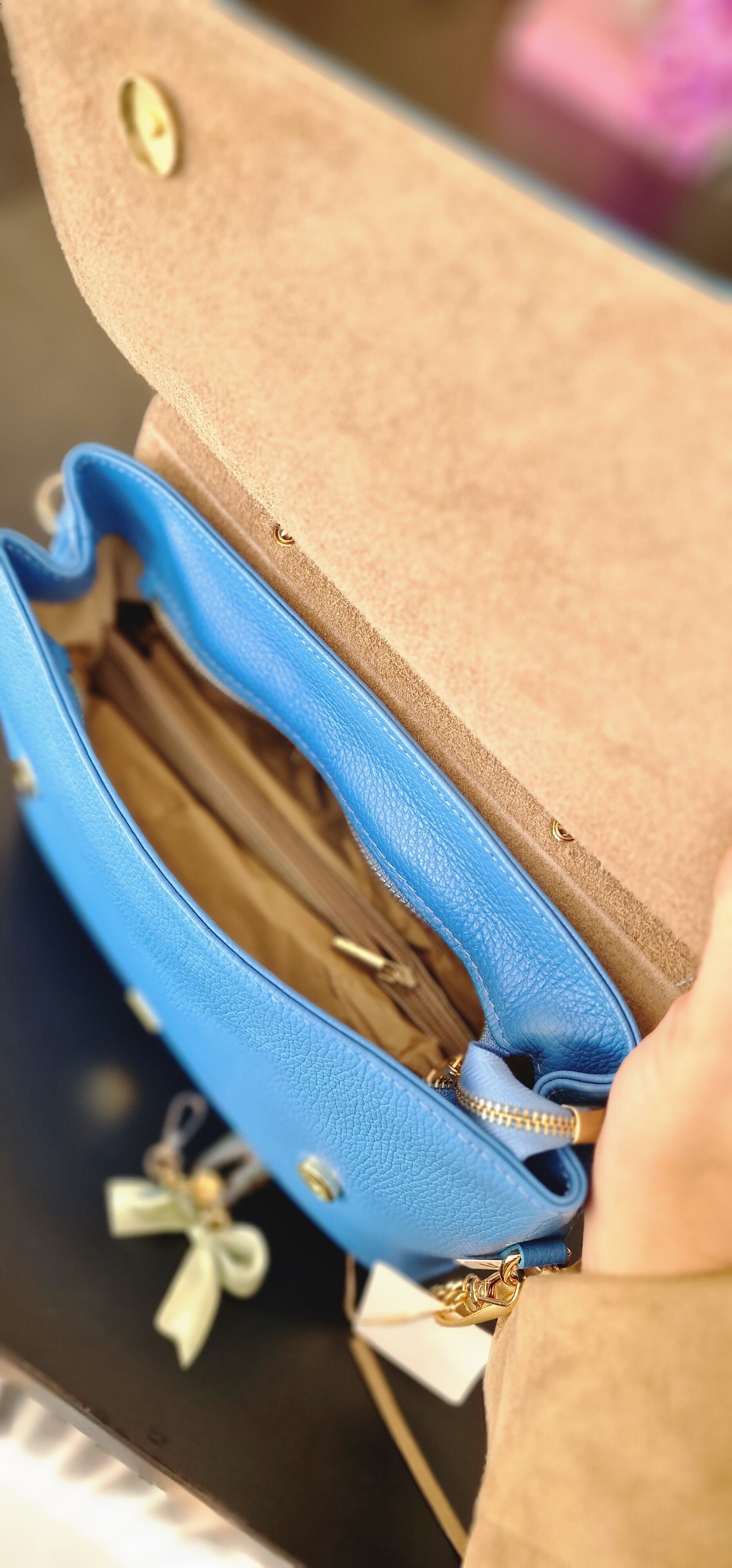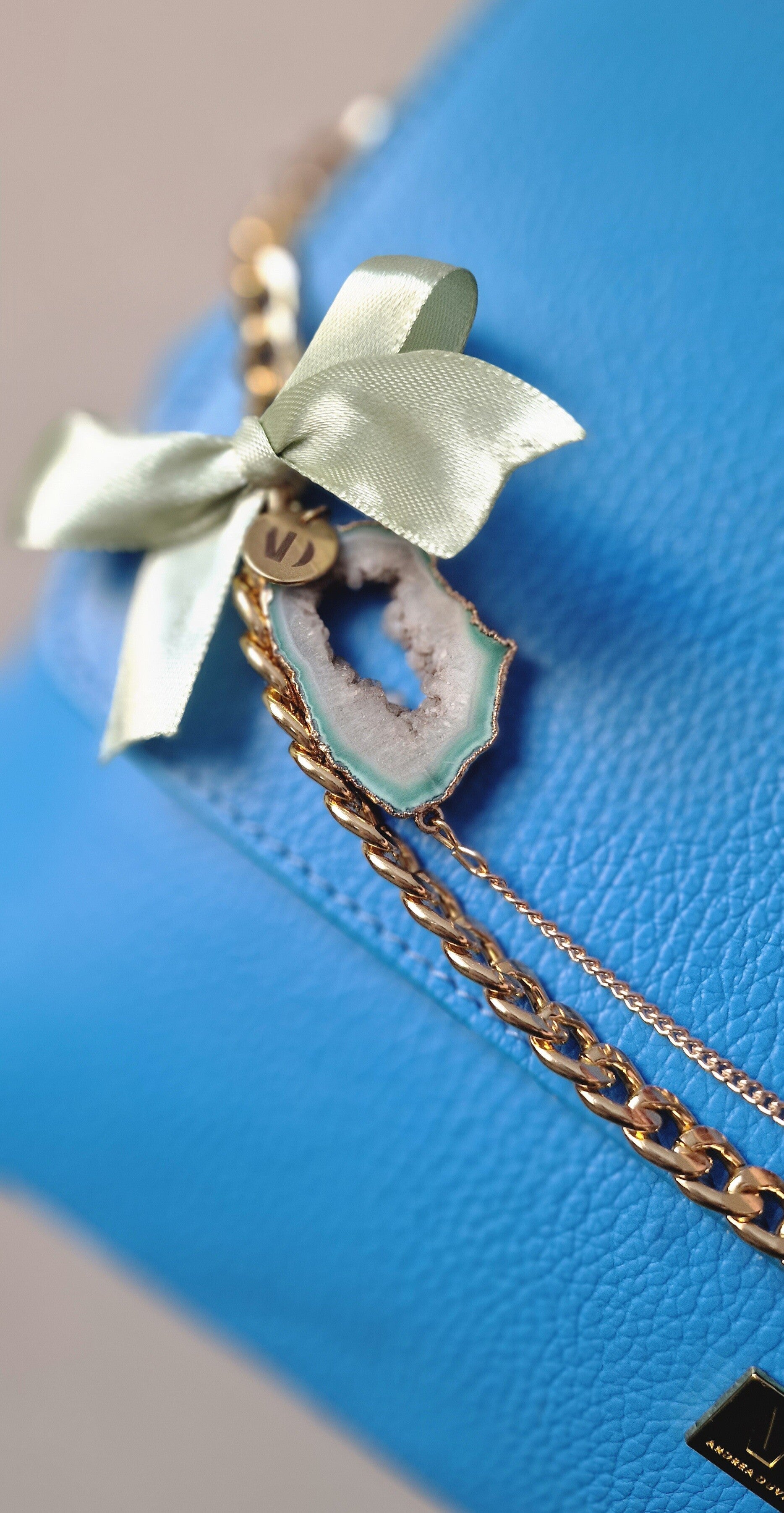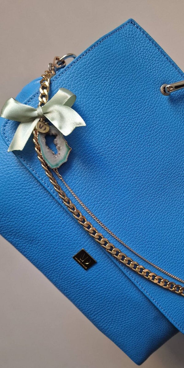 De tas valt direct op door de diepe, stijlvolle blauwe kleur, afgewerkt met een prachtige agaat slice en een elegante chain. Deze details geven de tas een unieke en luxe look.